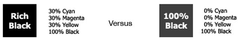 If you have small, thin text on your piece, it is STRONGLY recommended that you DO NOT use Rich Black on your piece. Although, using a 4-color black is recommended on larger areas, using rich black text on small areas will make your text blurry and at times, unreadable.