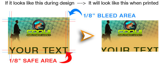 Although our cutters are precise, we can not guarantee any print job to be cut accurately unless it has the proper bleed. There are no exceptions. Also, please keep your text at least 1/4" away from the edge of artwork. This way your text is in a "safe" area and won't be in danger of cutting off.