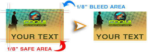 During the cutting process, about 1/8” on all sides of your artwork will be trimmed off. This is considered "bleed" area. Make sure you do not have any important content in this area. Adjust your artwork to compensate for cutting by allowing an extra 1/8” beyond the finished size of your piece. (See Diagram Below, Also see Size)